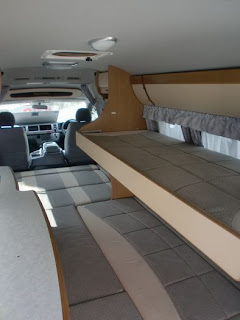 後部の横向きシート(定員4名)、背もたれを持ち上げると2段ベッドの完成です。