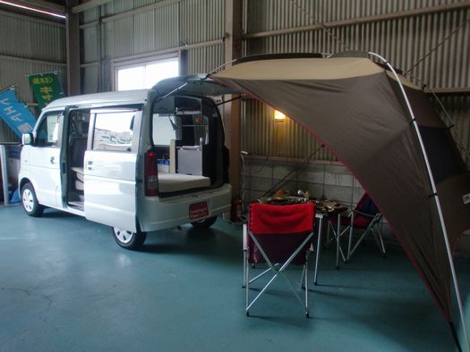 展示場奥に置いていた軽キャンパー「スクラム・キャンパー」を展示場入口横に移動し、