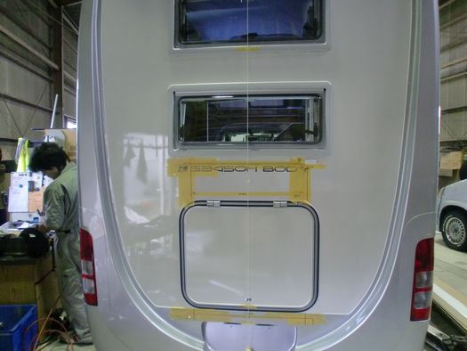 納車に向けてセキソーボディ・トム200に自転車キャリア取付中。