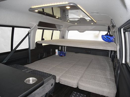 セカンドシートはトヨタ純正シート、その後ろに左右3名ずつの横向きシート