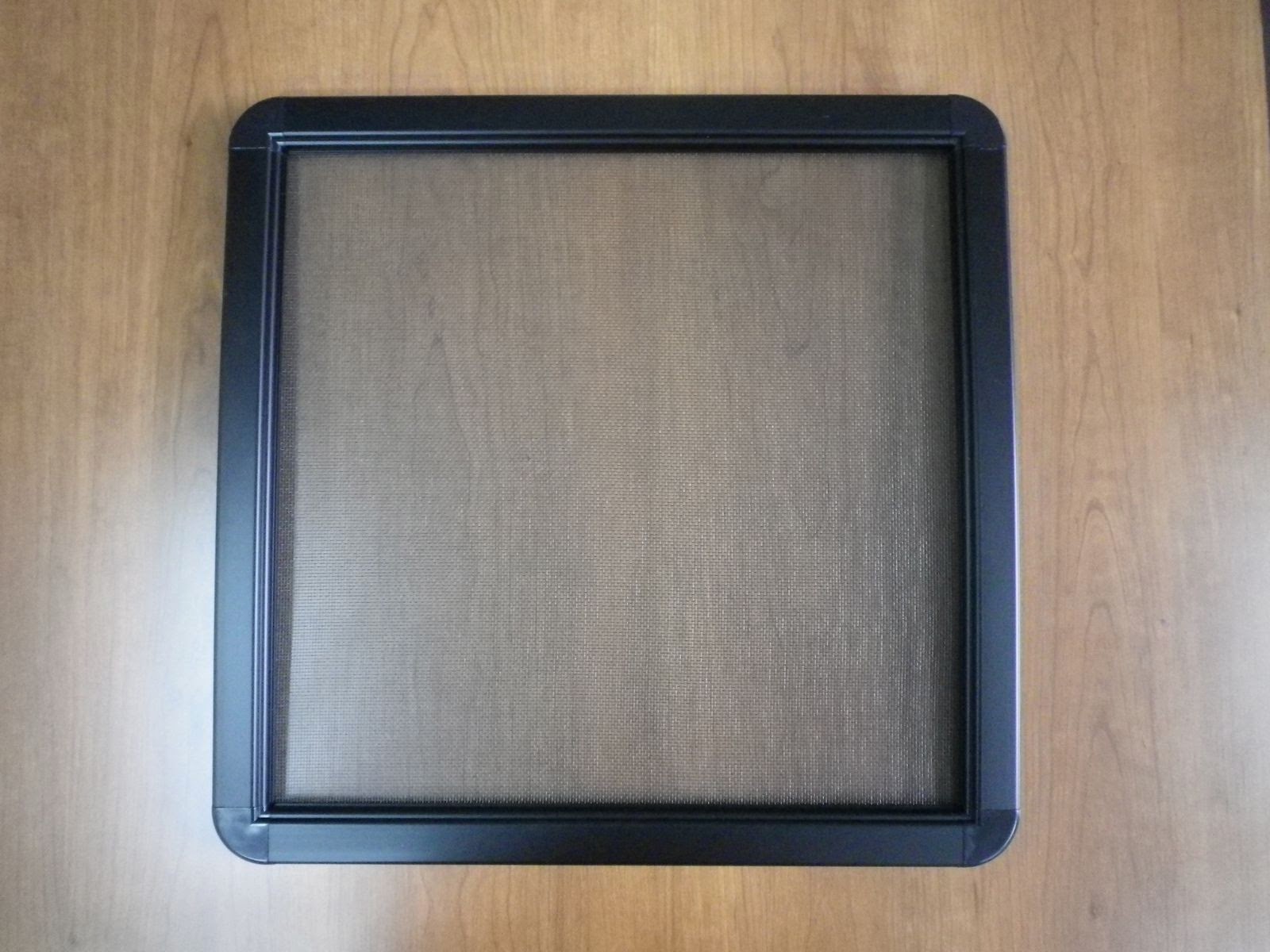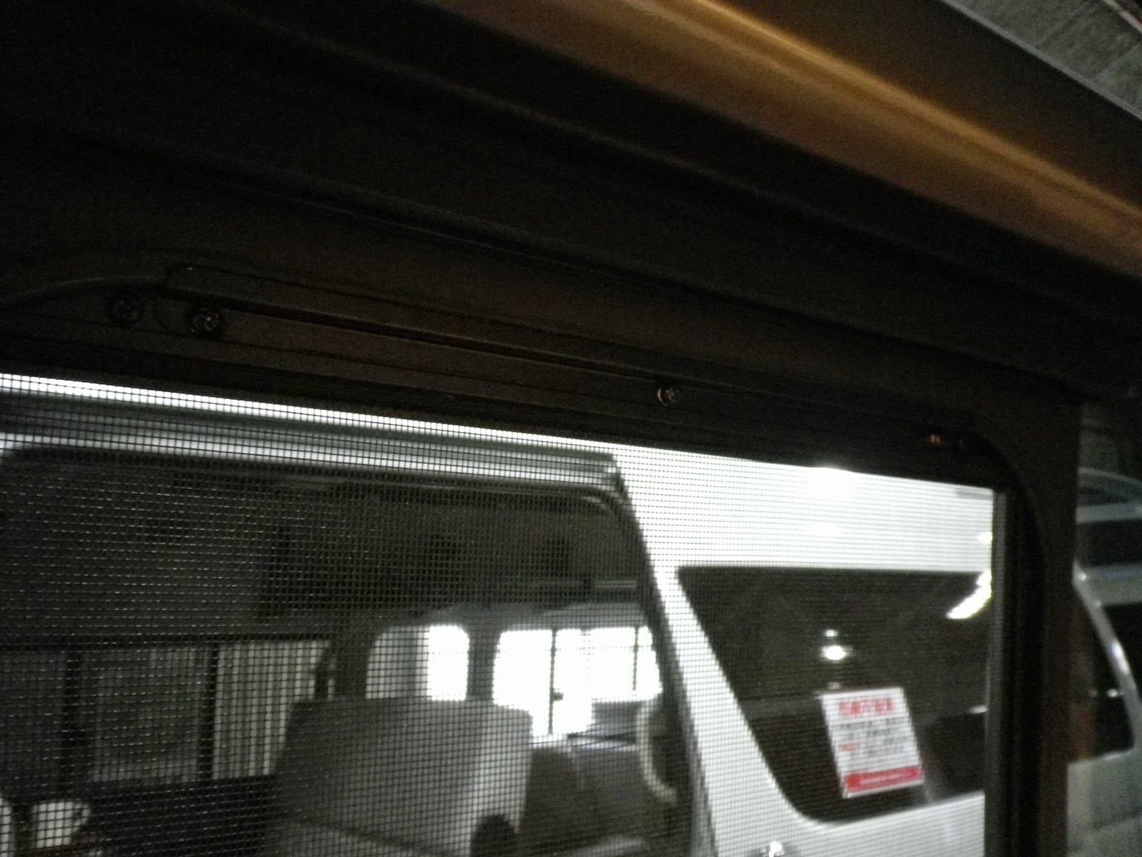 3.上側の金具をビスで留めます。(外側からアミエースを押さえてもらうか、テープなどで貼りつけてください)