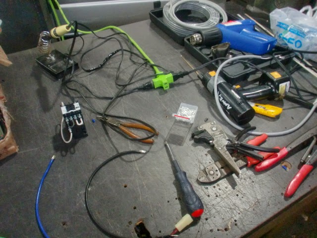 配線やら、はんだごての線やら、ドライヤーの線やら机の上が線だらけ。