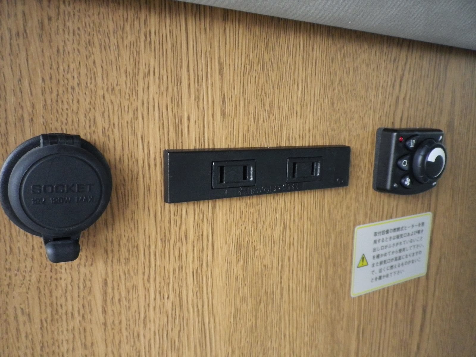 左から、DC12Vソケット・AC100Vコンセント・FFヒータースイッチ