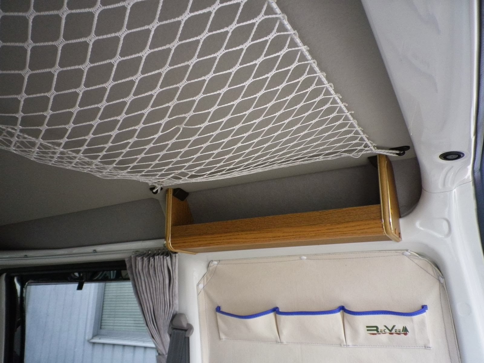 オーバーヘッド収納が左右にあり、天井には収納ネット