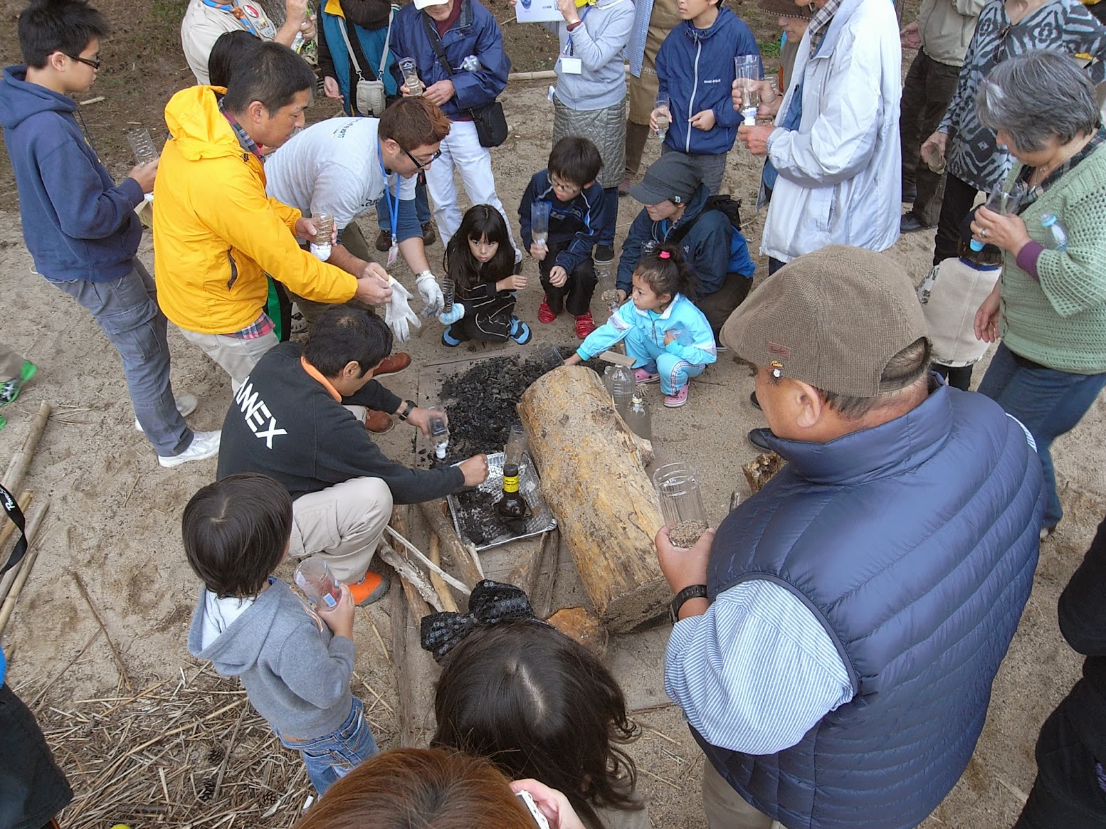 その上から泥水を流し入れると、ろ過された水が出てきます。