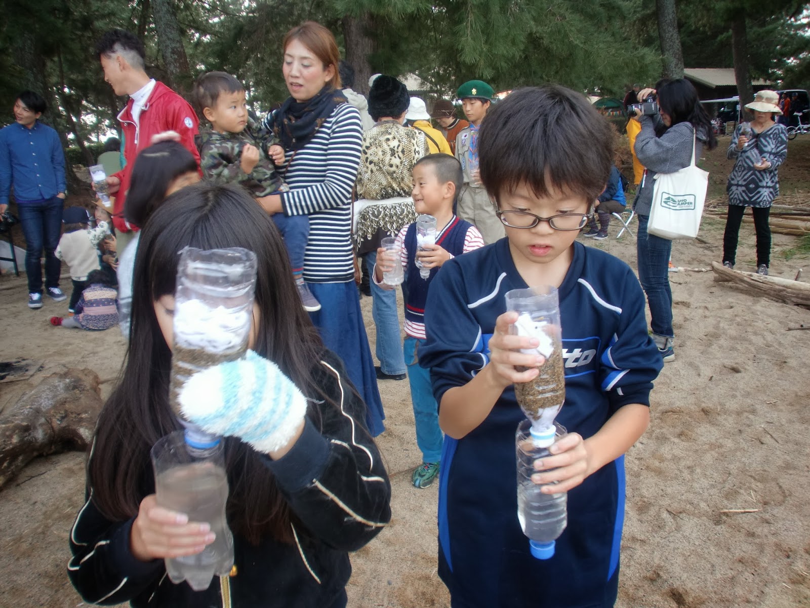 ペットボトルの中に小石、砂、炭、砂、布の順に詰めていきます。