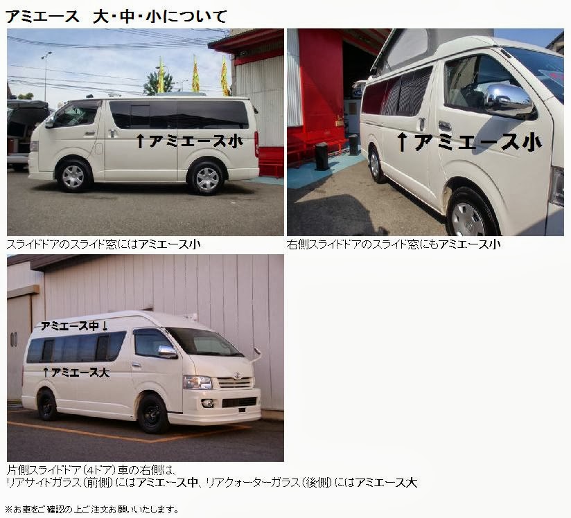 「アミエース」はハイエースの各窓専用設計のため、大中小それぞれ大きさが異なります。
