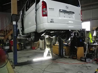 展示場奥のピットではFFヒーター取付のためファミリーワゴンCがリフトで上がっています。