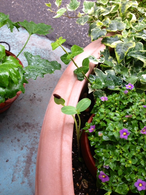 | な!なんと!オリーブの鉢から!スイカの芽が出てきました!! コレ!ホントにホント!! |