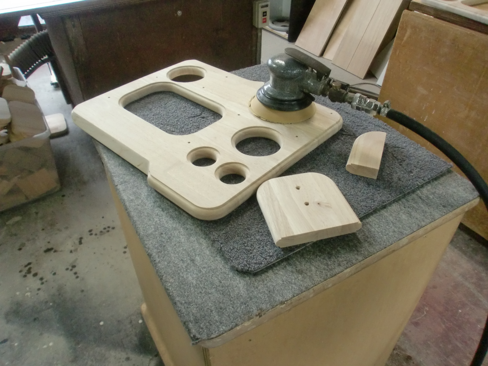 徳島工場、最新機材により木材をカット。そこに傘たて、カップホルダー、ゴミ袋用の穴をカットした状態で大阪に入荷してまいります。