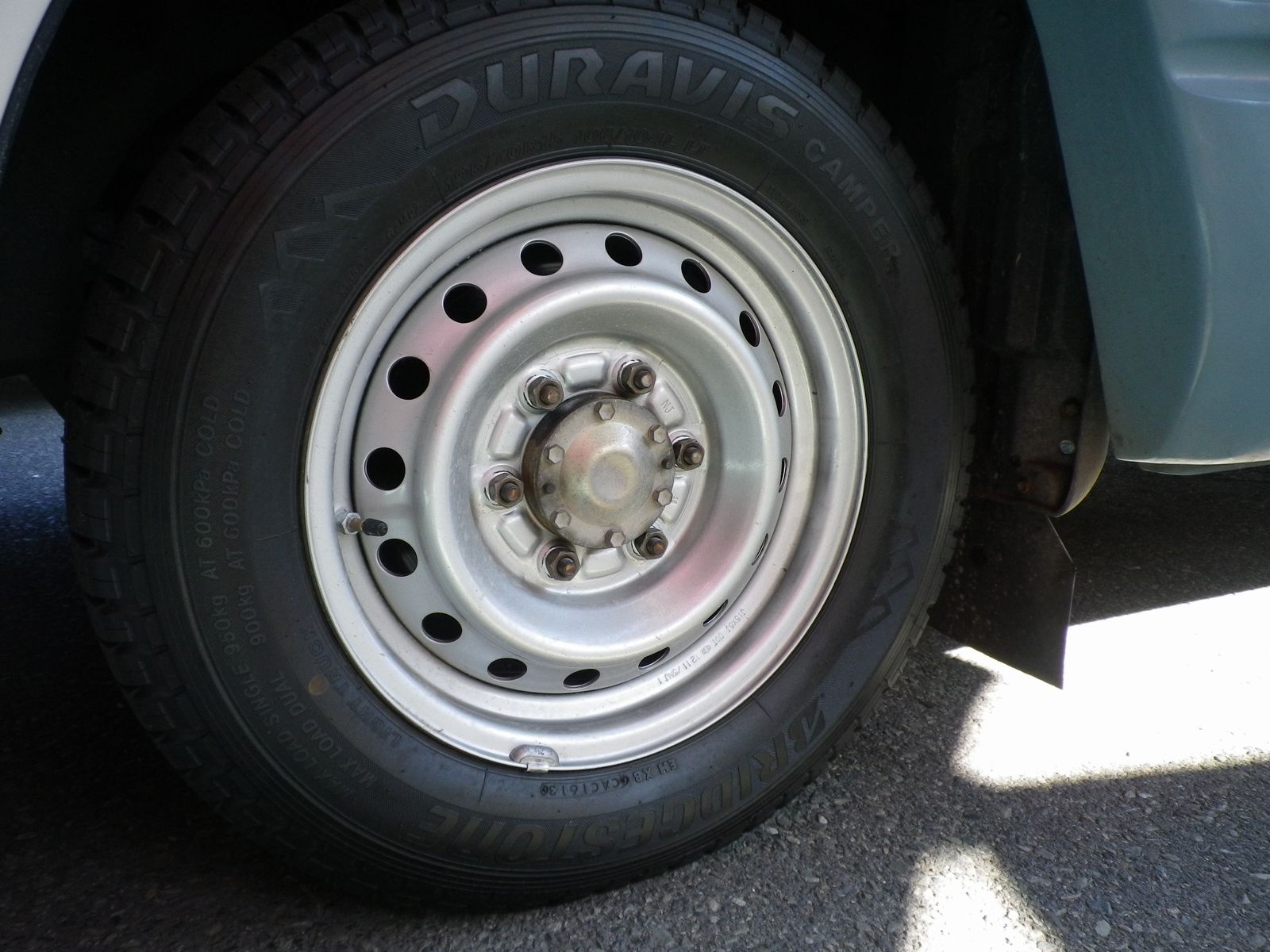 車検で入庫中のお客様のキャンピングカー、よくみると先日紹介したブリヂストンのキャンピングカー専用タイヤ「DURAVIS CAMPER(デュラビス キャンパー)」を履いていました。