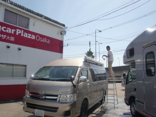 本日のキャンピングカープラザ大阪では、今週末納車予定のキャンピングカーを洗車中