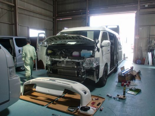 こちらでは、ハイエースの顔面がバラバラに!取付部品がたくさんあります。