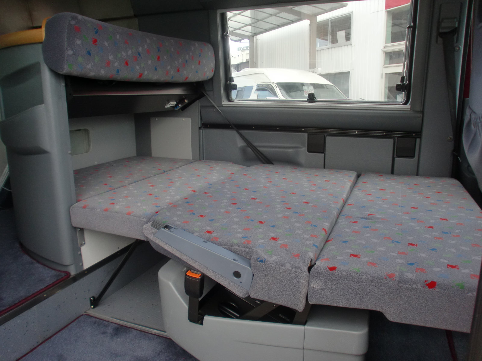 装備:サイドオーニング、バックカメラ、冷蔵庫、2バーナーコンロ、FFヒーター、カセットトイレ、 温水シャワー、脱着式テーブル、2段ベッドなど