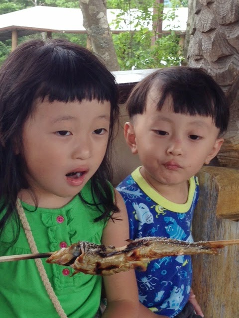 | お風呂あがりに岩魚の丸焼きを食べてる様子! *写真では全く伝わりませんがスゴク美味しかったです!! |