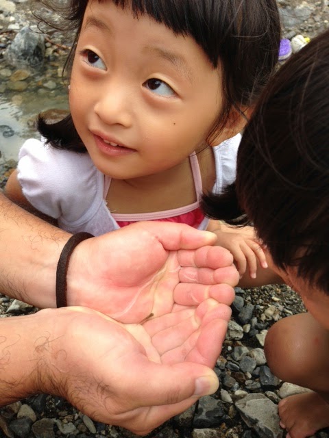 お風呂あがりに岩魚の丸焼きを食べてる様子! *写真では全く伝わりませんがスゴク美味しかったです!! |