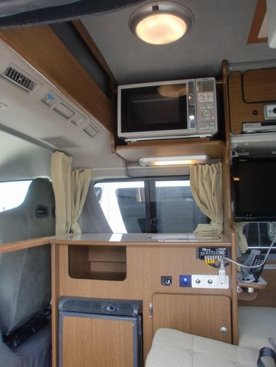 天井には、自動追尾式BS/110°CSデジタルアンテナ、ファンタスティックベント+ベンチレーターカバー、ソーラーパネル、ガゼルアンテナ(地上デジタル対応)が装備