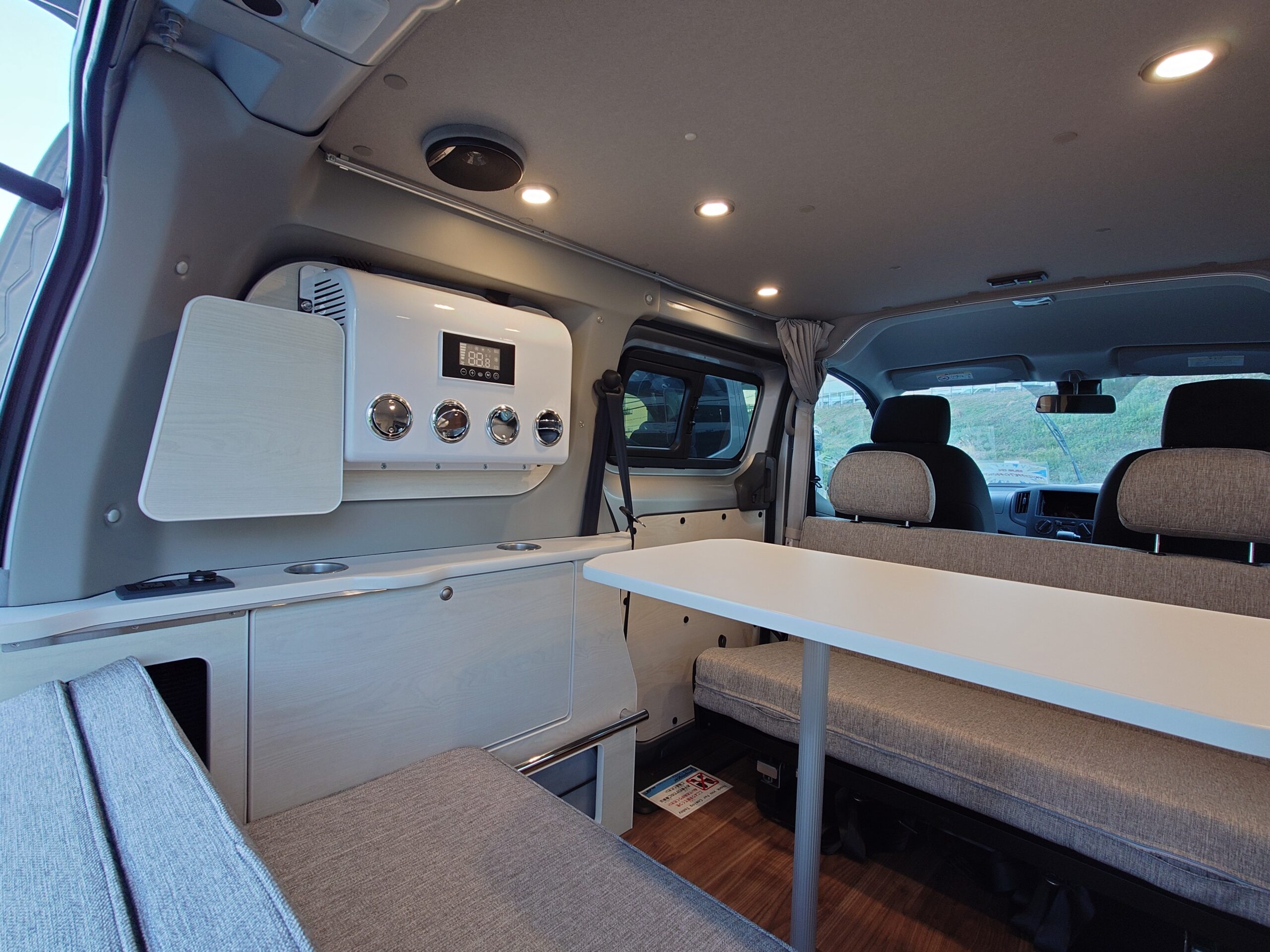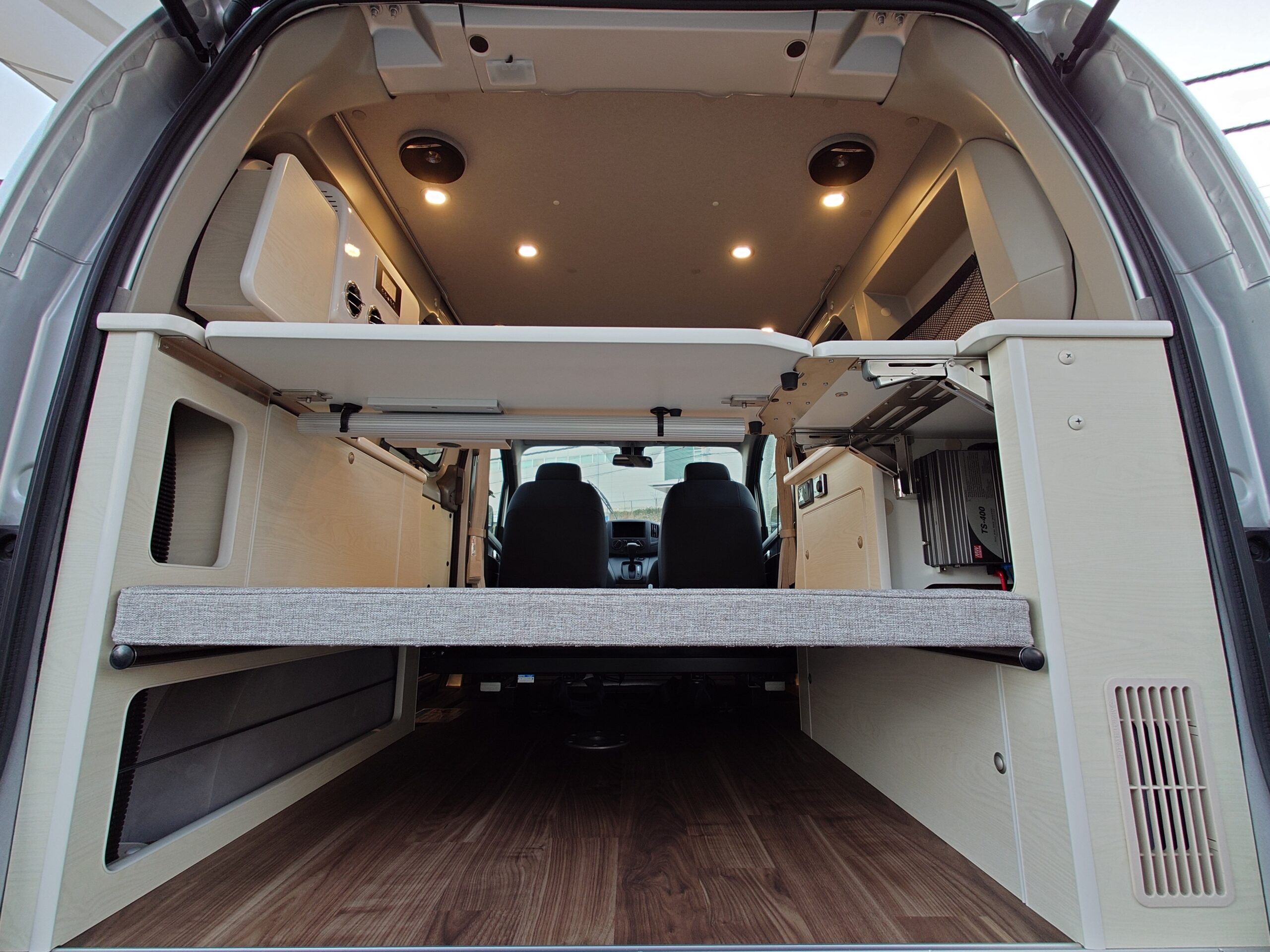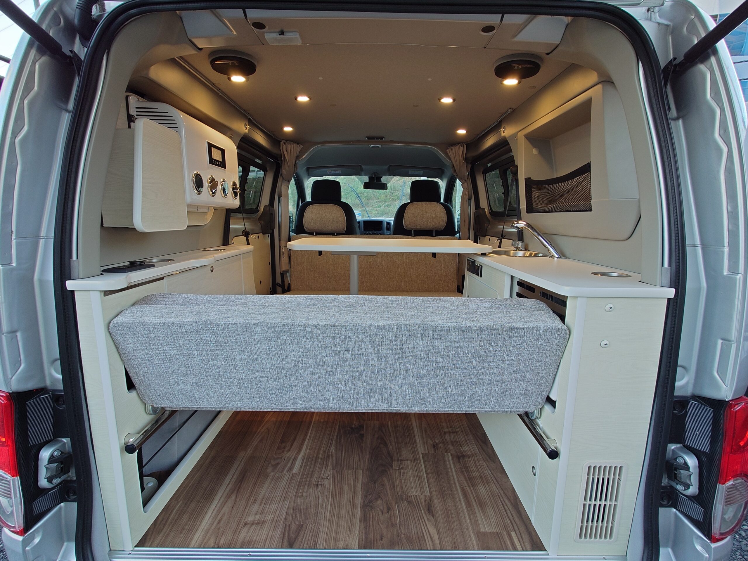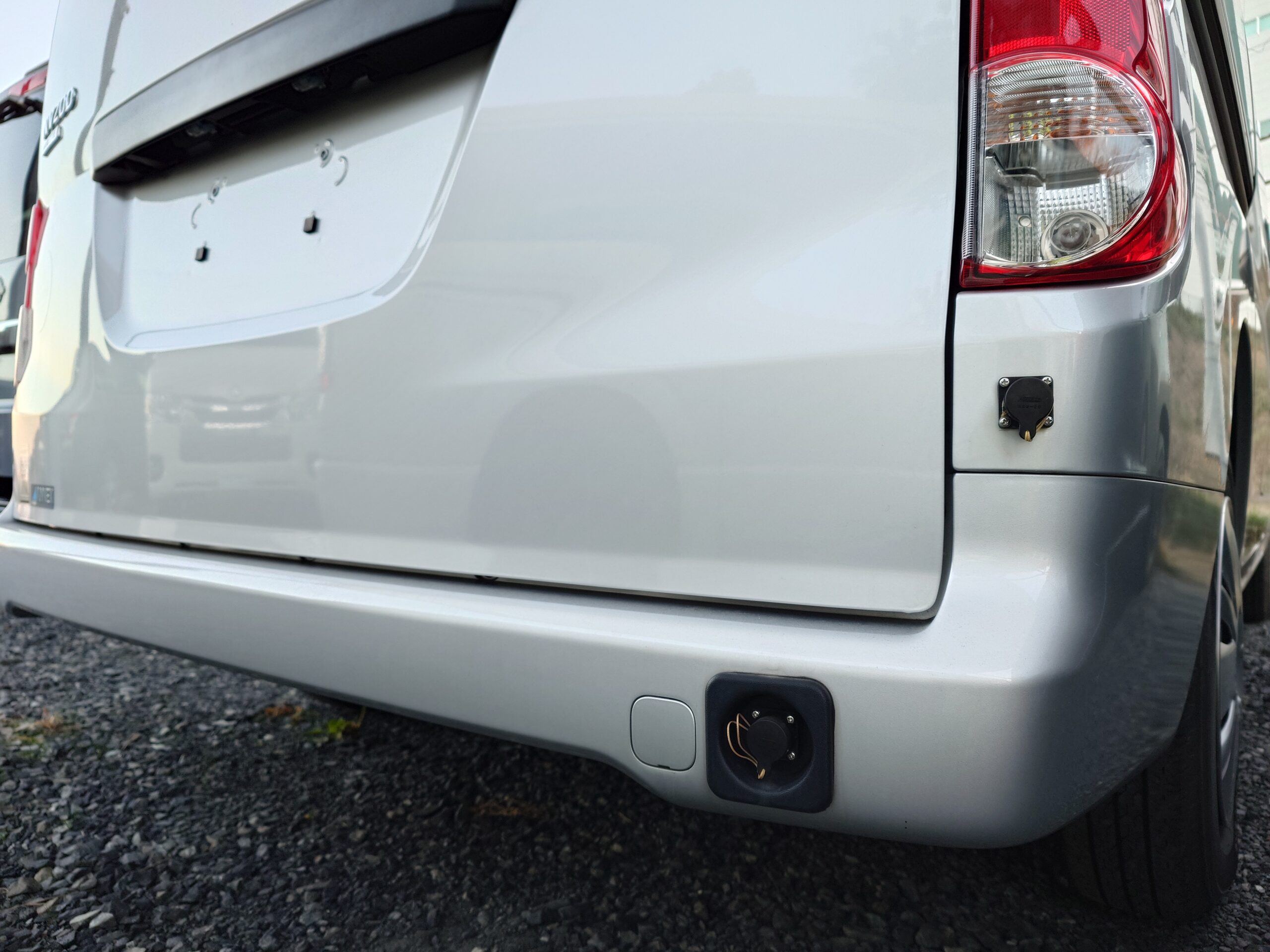 リアアクリルウインドウ、カーテン8面、外部電源(10A)+100Vコンセント、ファミリーワゴンSS専用ユニットシェルフ、リアカーテンレス、スライドドア+リアハッチ(ライト付)トリム
