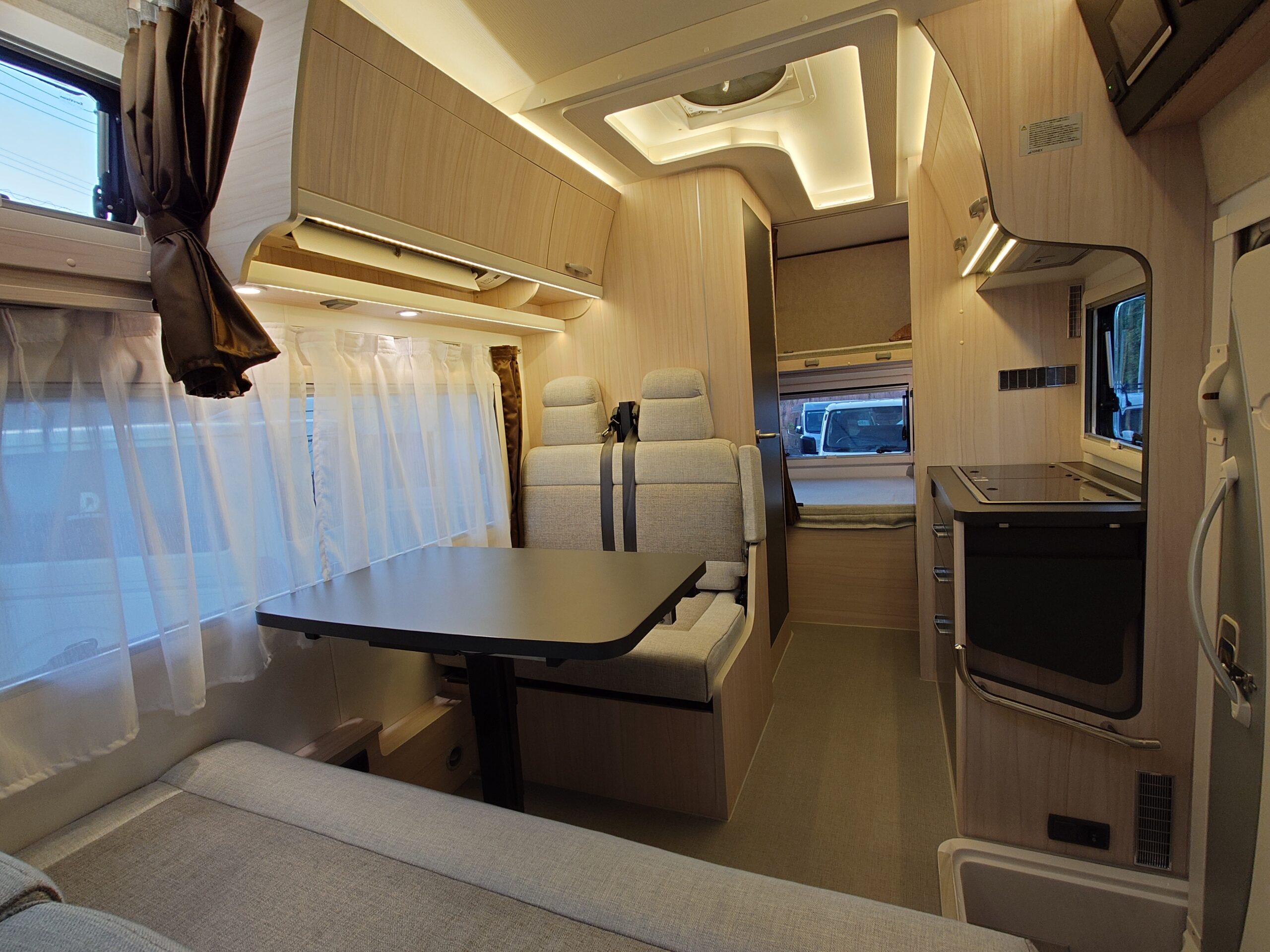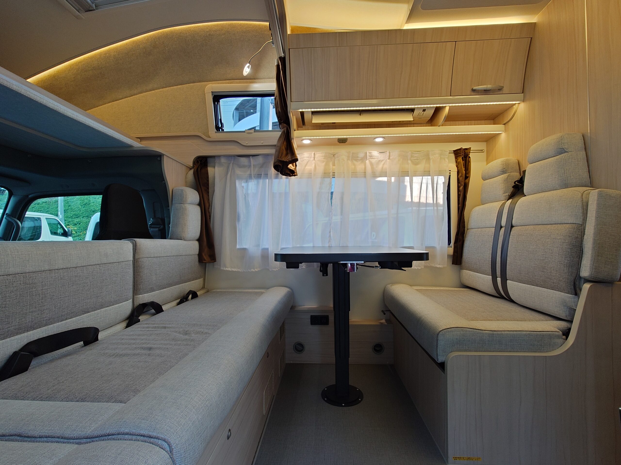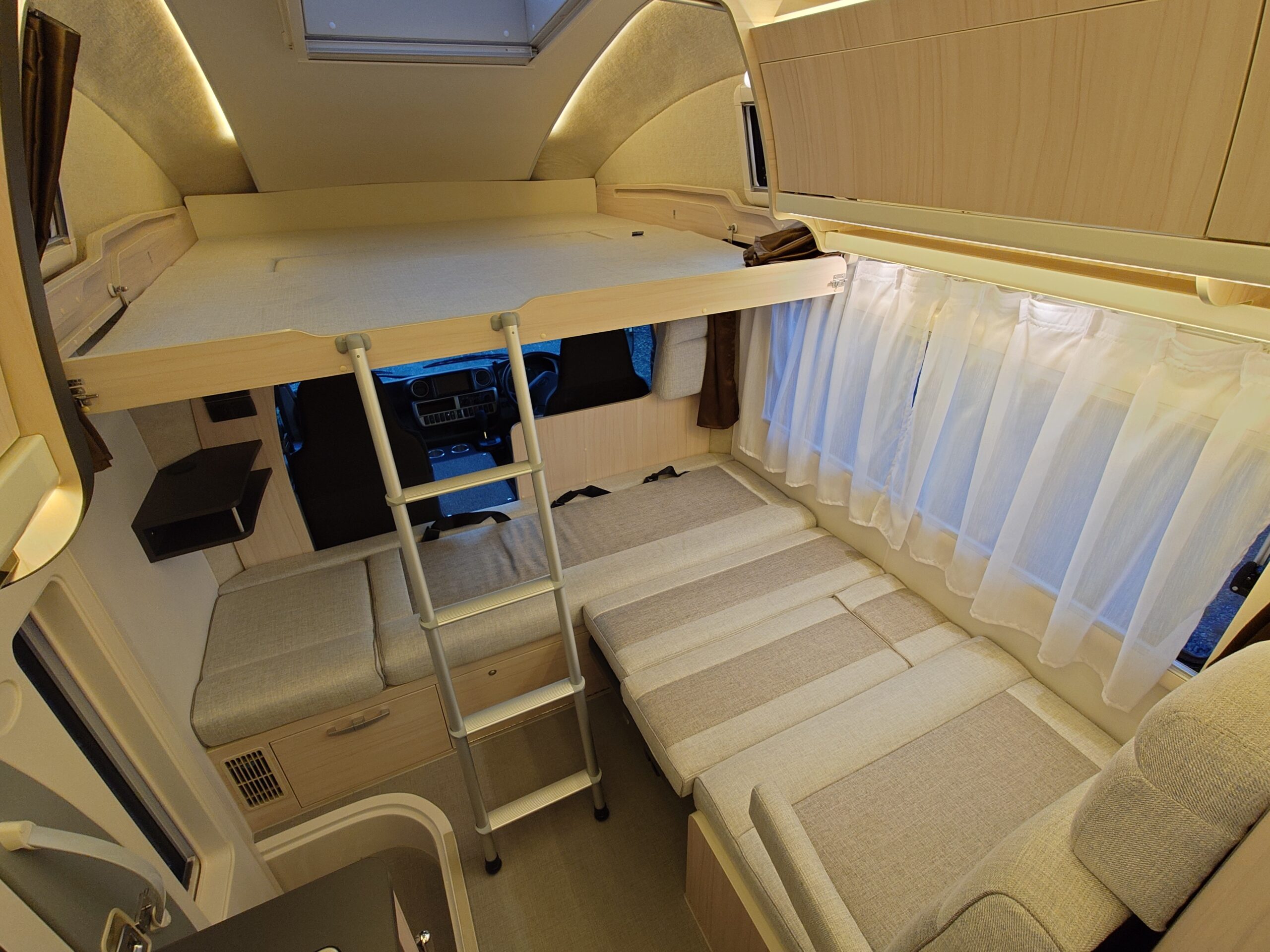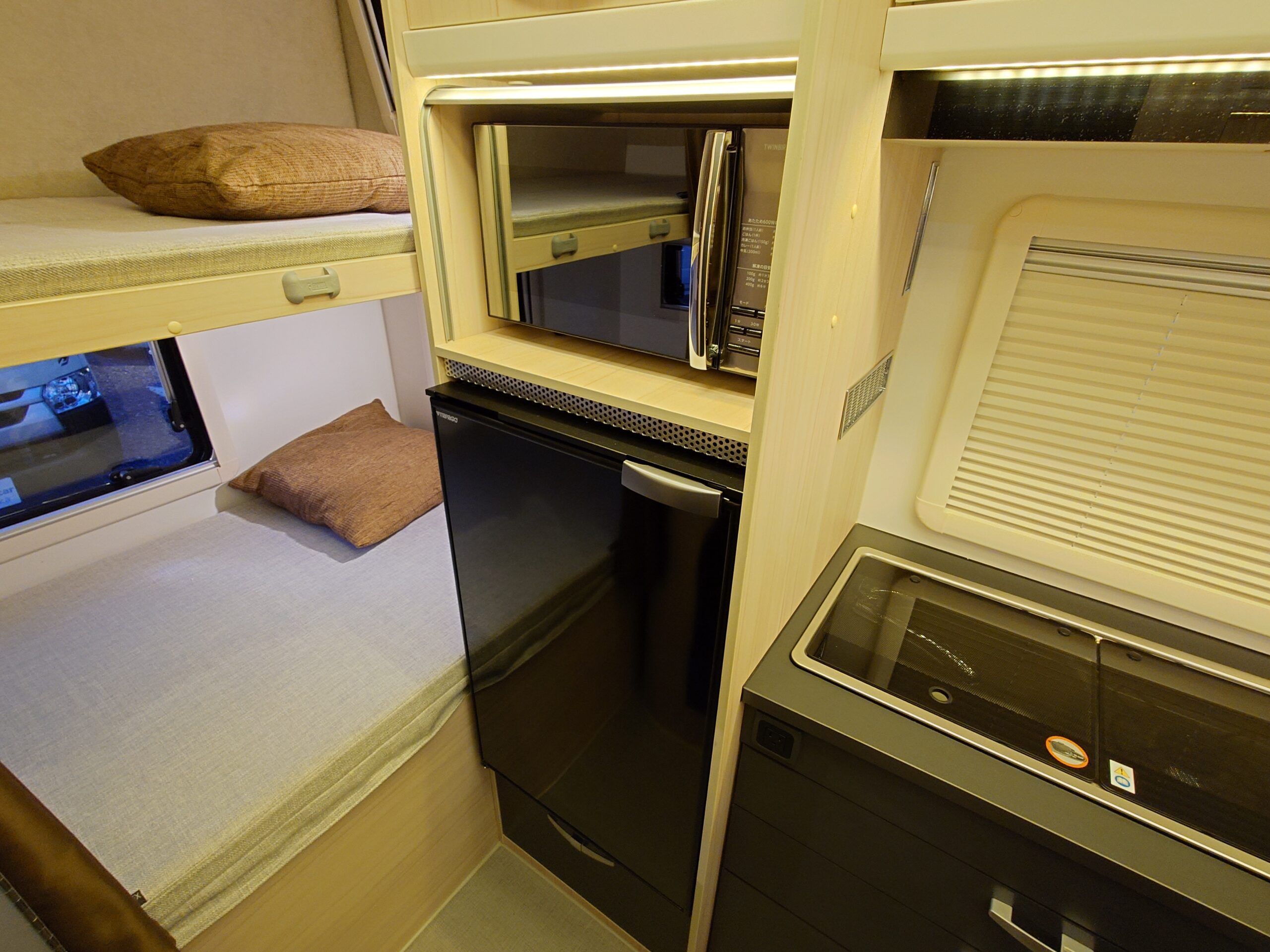 リチウムバッテリー、家庭用エアコン、床暖房、FFヒーター、ソーラーパネル、サイドオーニング、バンクベッド、スカイライトルーフ、常設2段ベッド、カセットトイレ、温水ボイラー、冷蔵庫、電子レンジ、ガラスカバー付シンク&ツーバーナーコンロ、レンジフード、マックスファン、ナビ、バックカメラ
