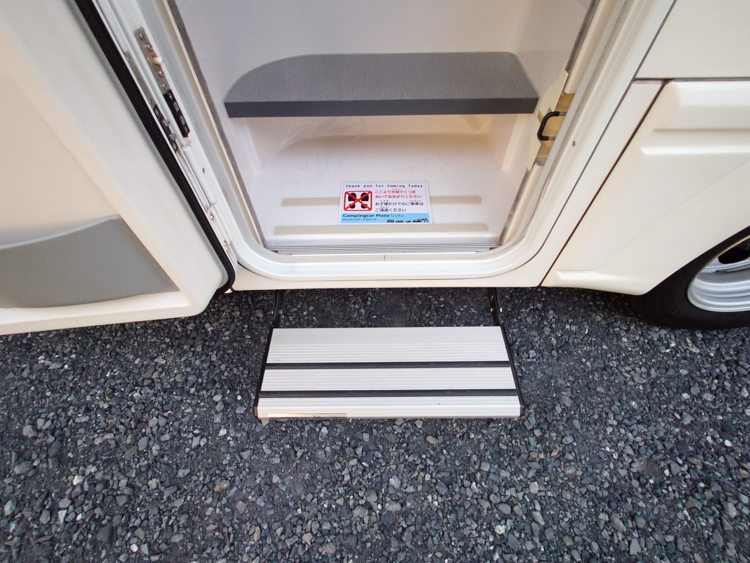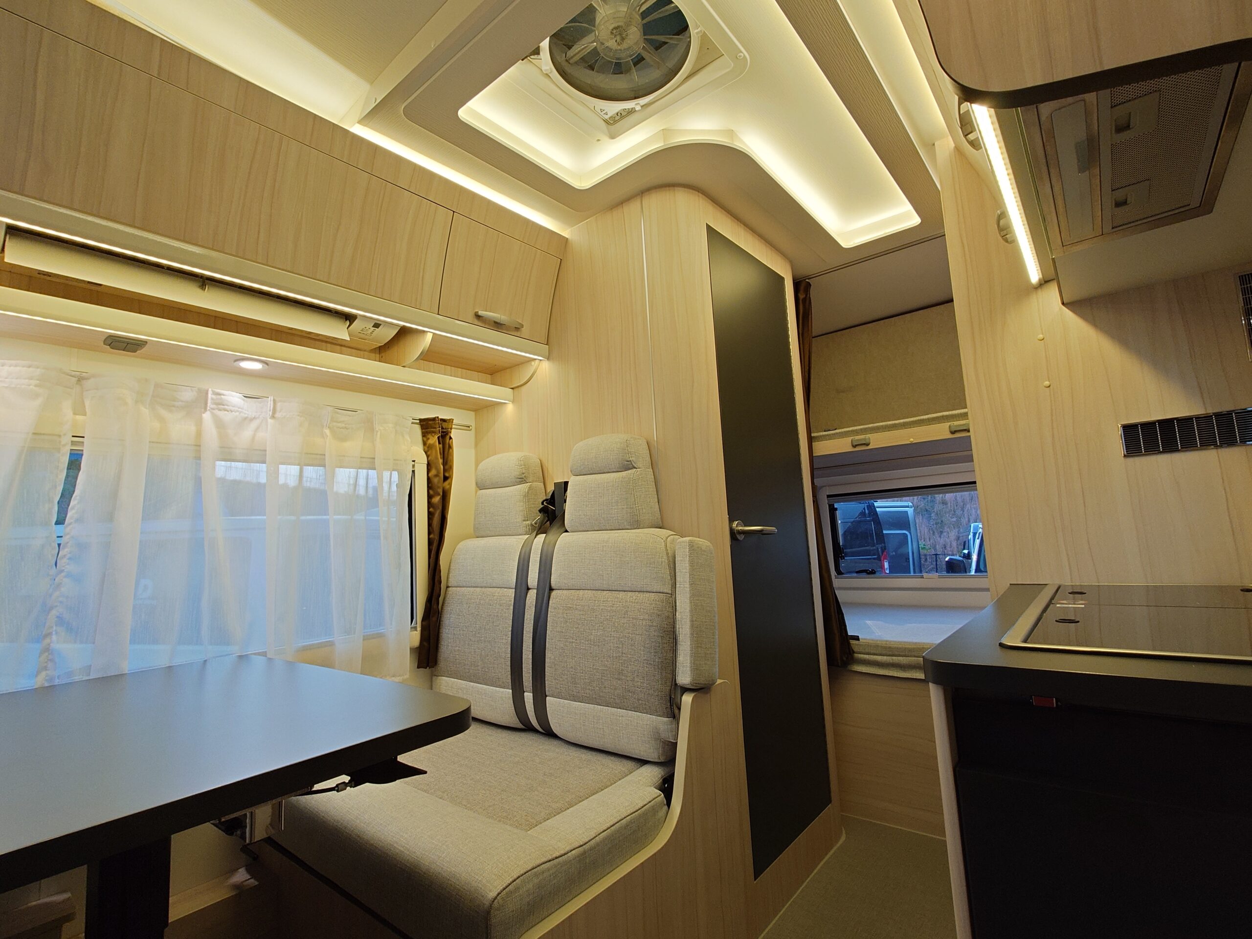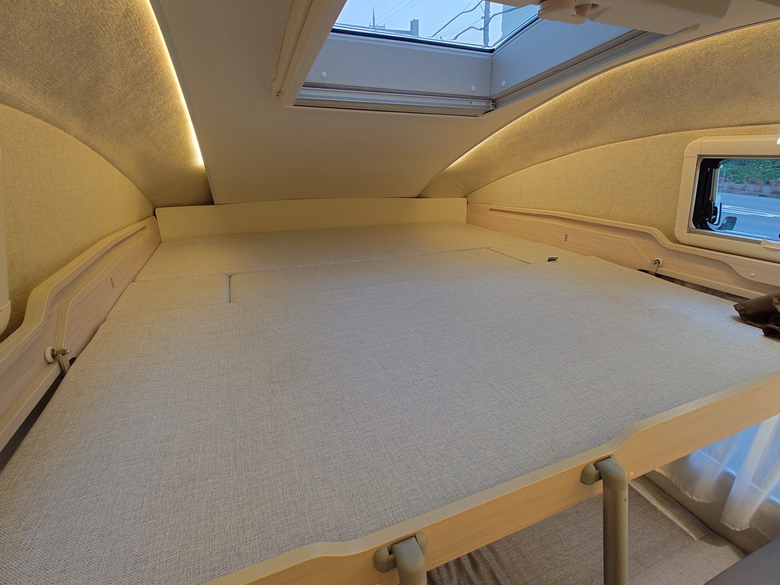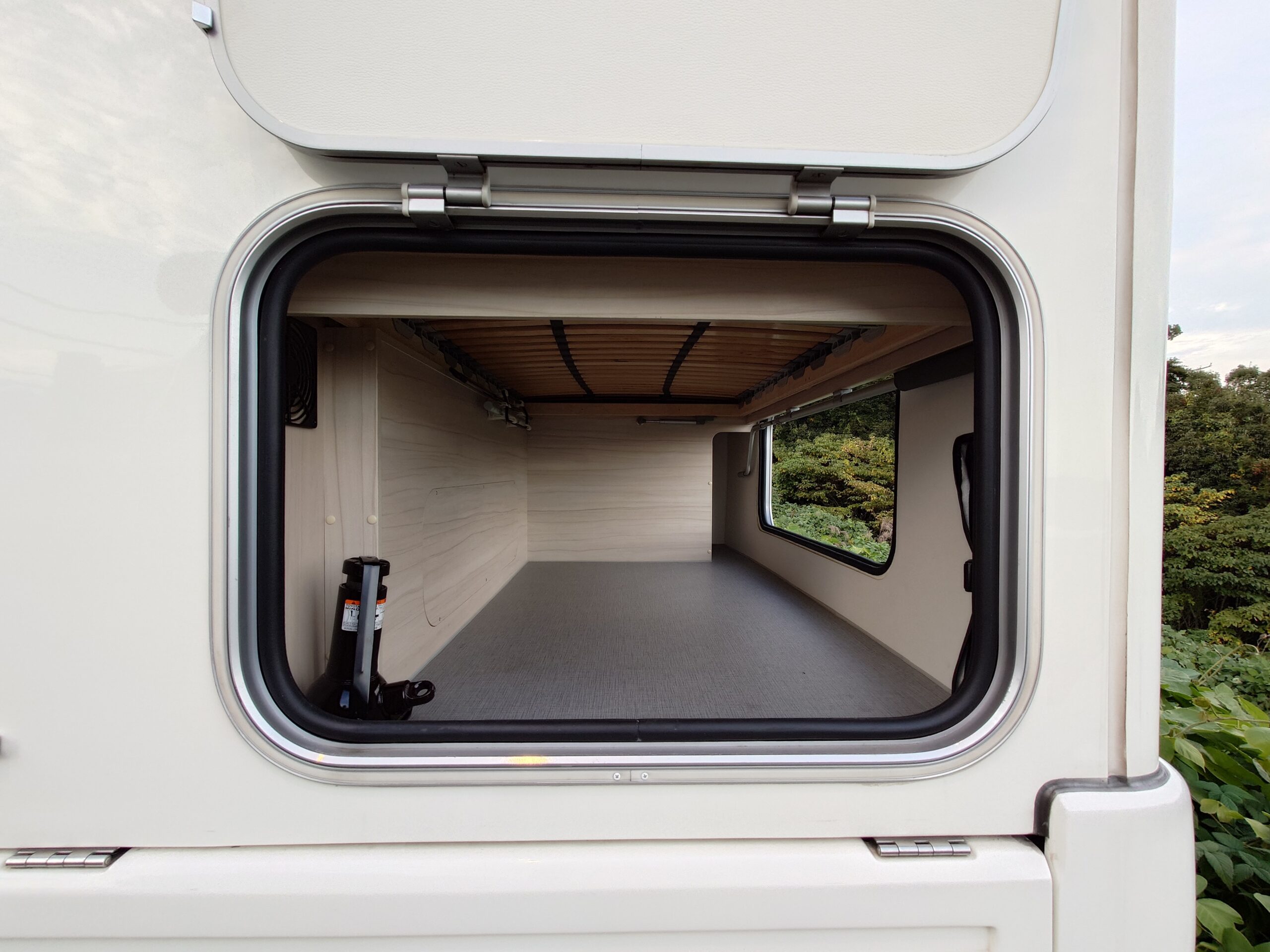 リチウムバッテリー、家庭用エアコン、床暖房、FFヒーター、ソーラーパネル、サイドオーニング、バンクベッド、スカイライトルーフ、常設2段ベッド、カセットトイレ、温水ボイラー、冷蔵庫、電子レンジ、ガラスカバー付シンク&ツーバーナーコンロ、レンジフード、マックスファン、ナビ、バックカメラ