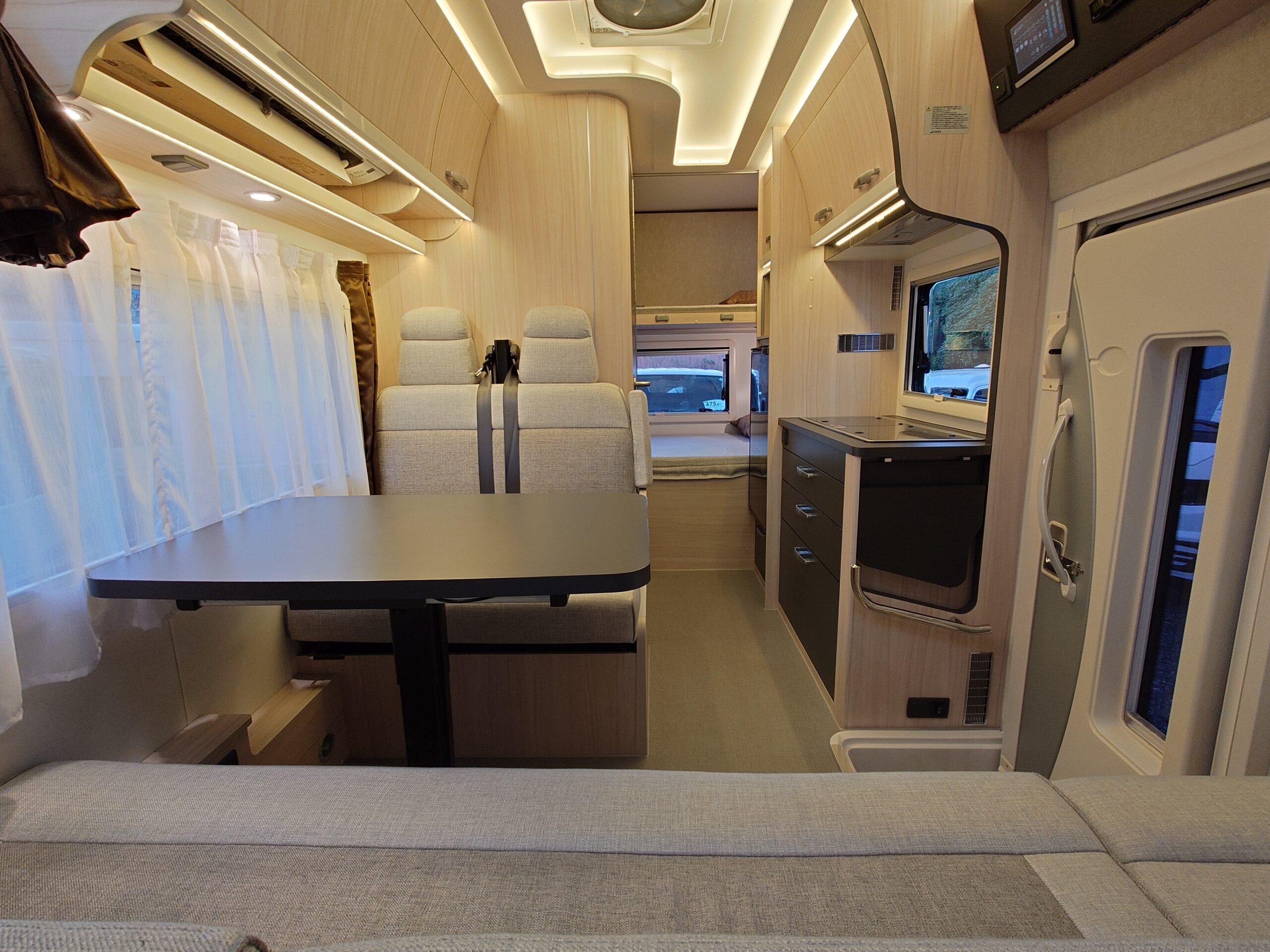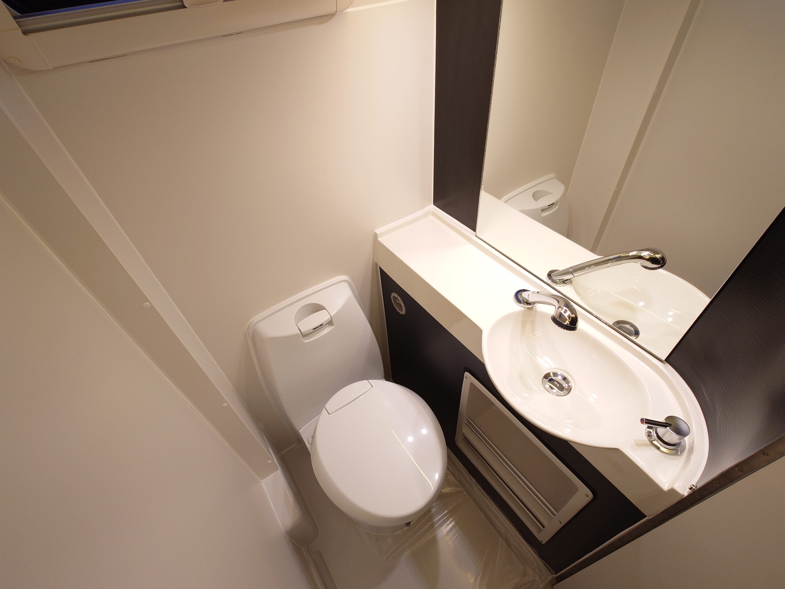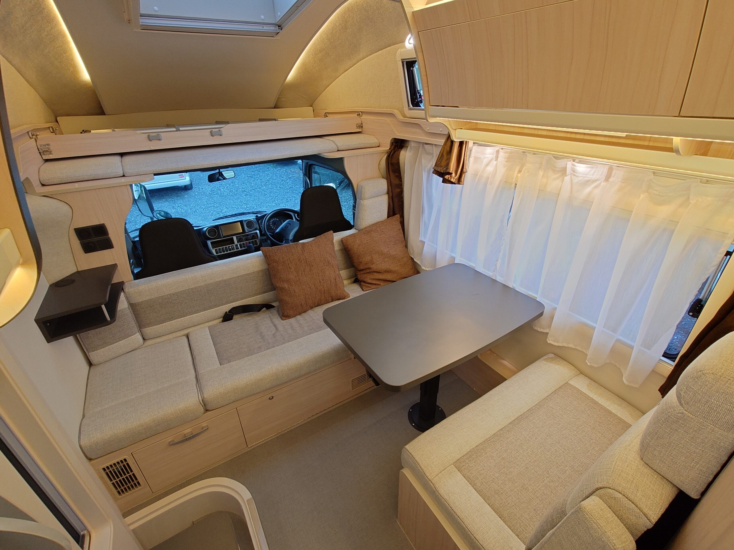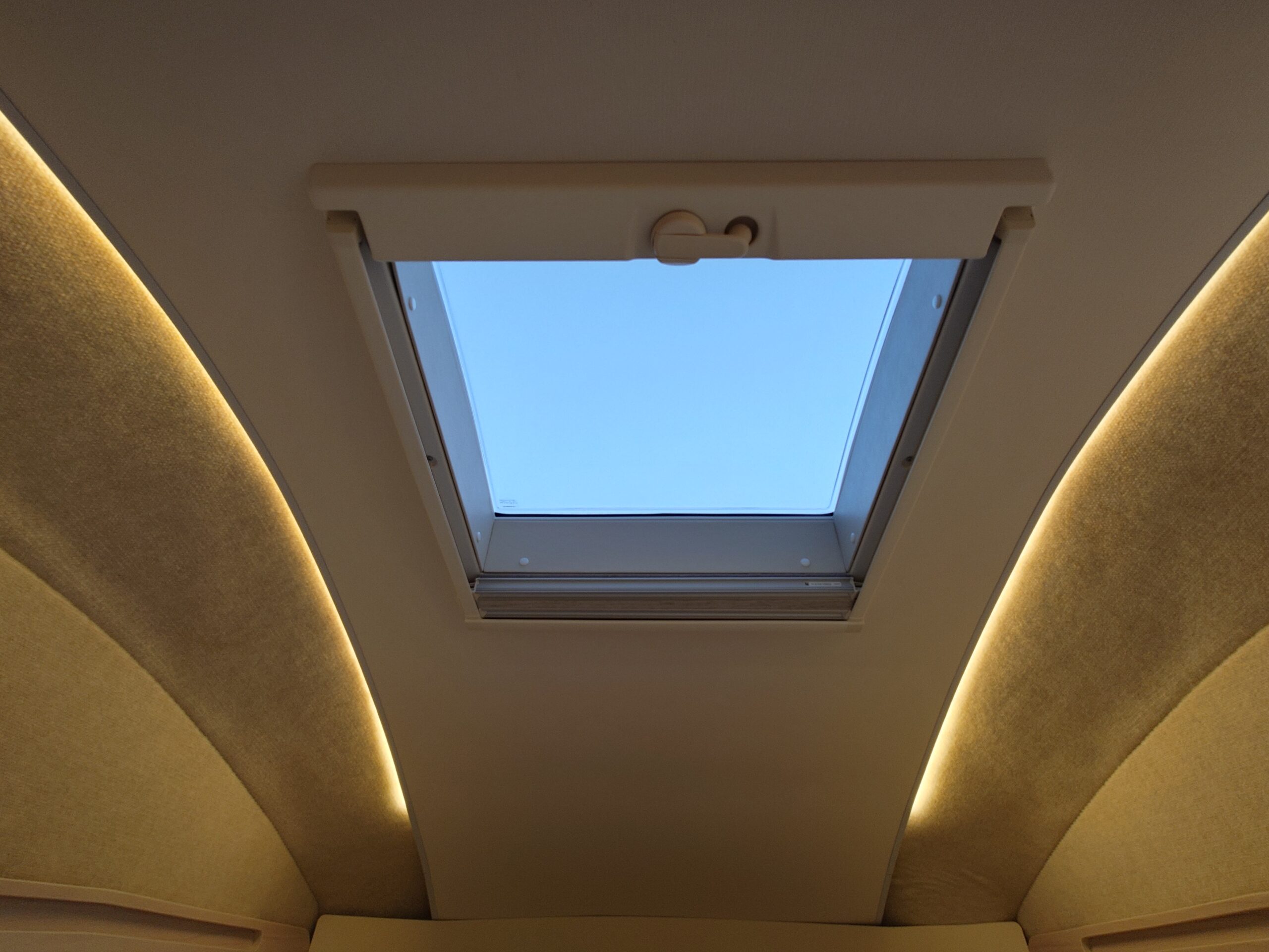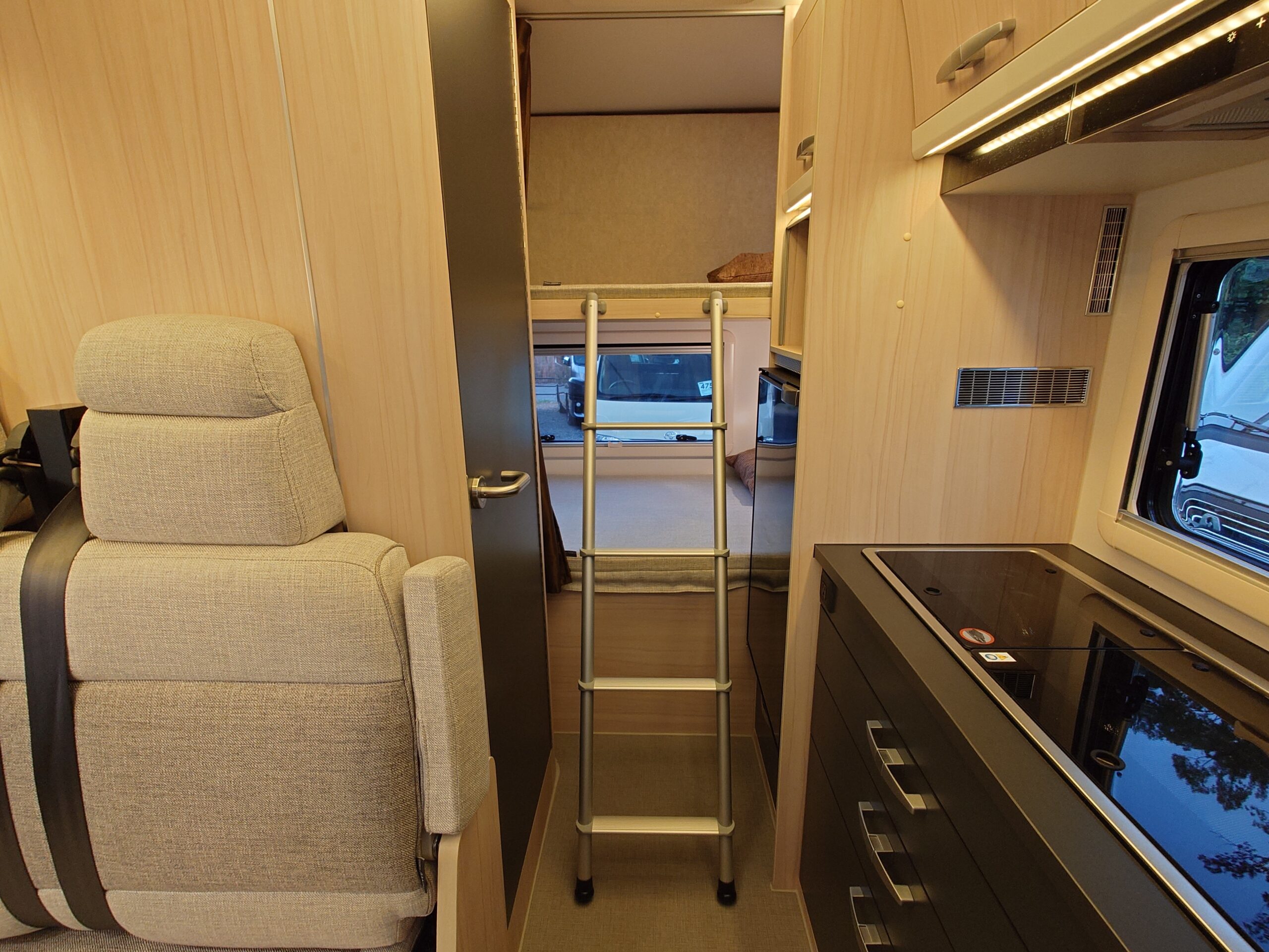 リチウムバッテリー、家庭用エアコン、床暖房、FFヒーター、ソーラーパネル、サイドオーニング、バンクベッド、スカイライトルーフ、常設2段ベッド、カセットトイレ、温水ボイラー、冷蔵庫、電子レンジ、ガラスカバー付シンク&ツーバーナーコンロ、レンジフード、マックスファン、ナビ、バックカメラ