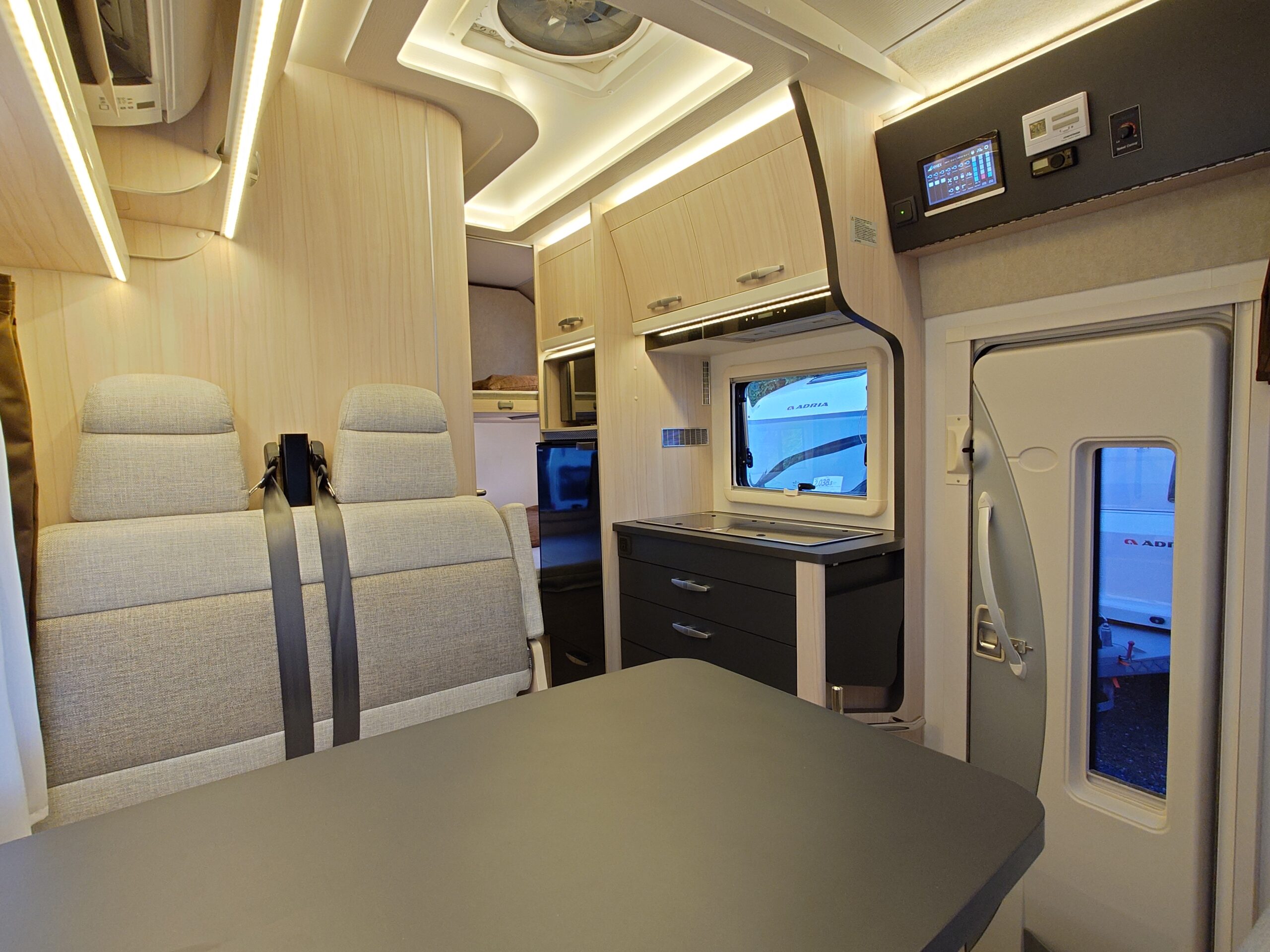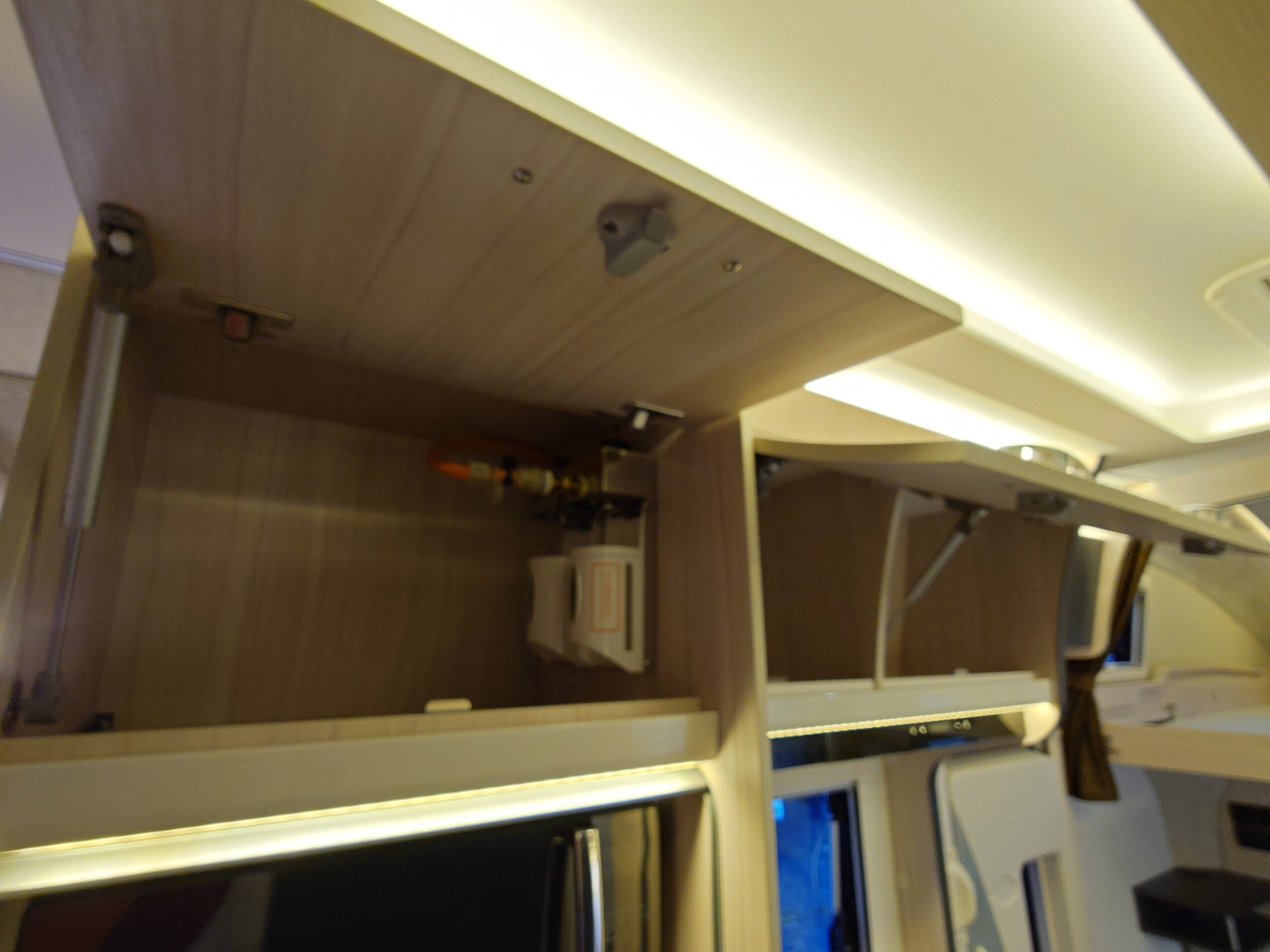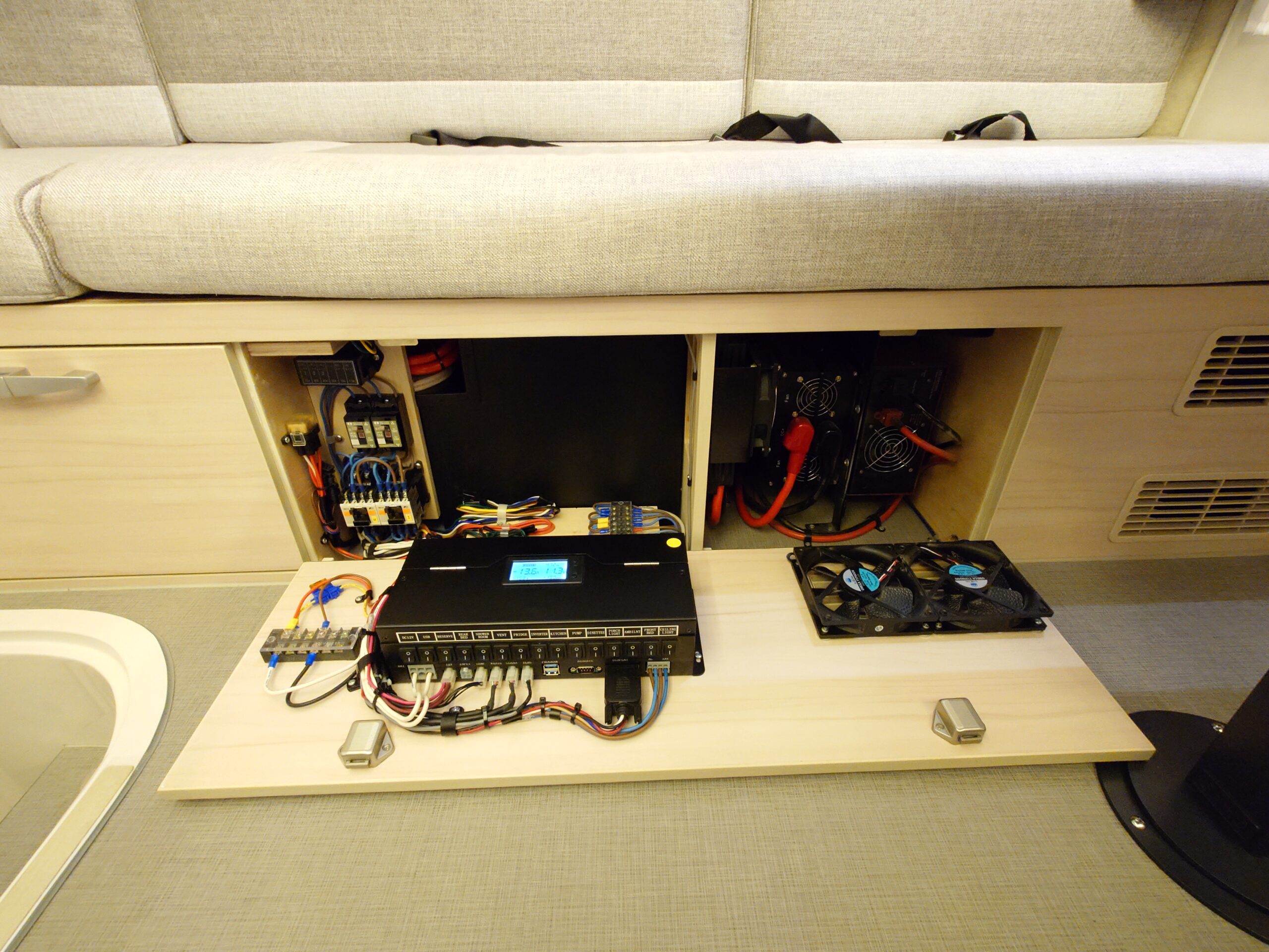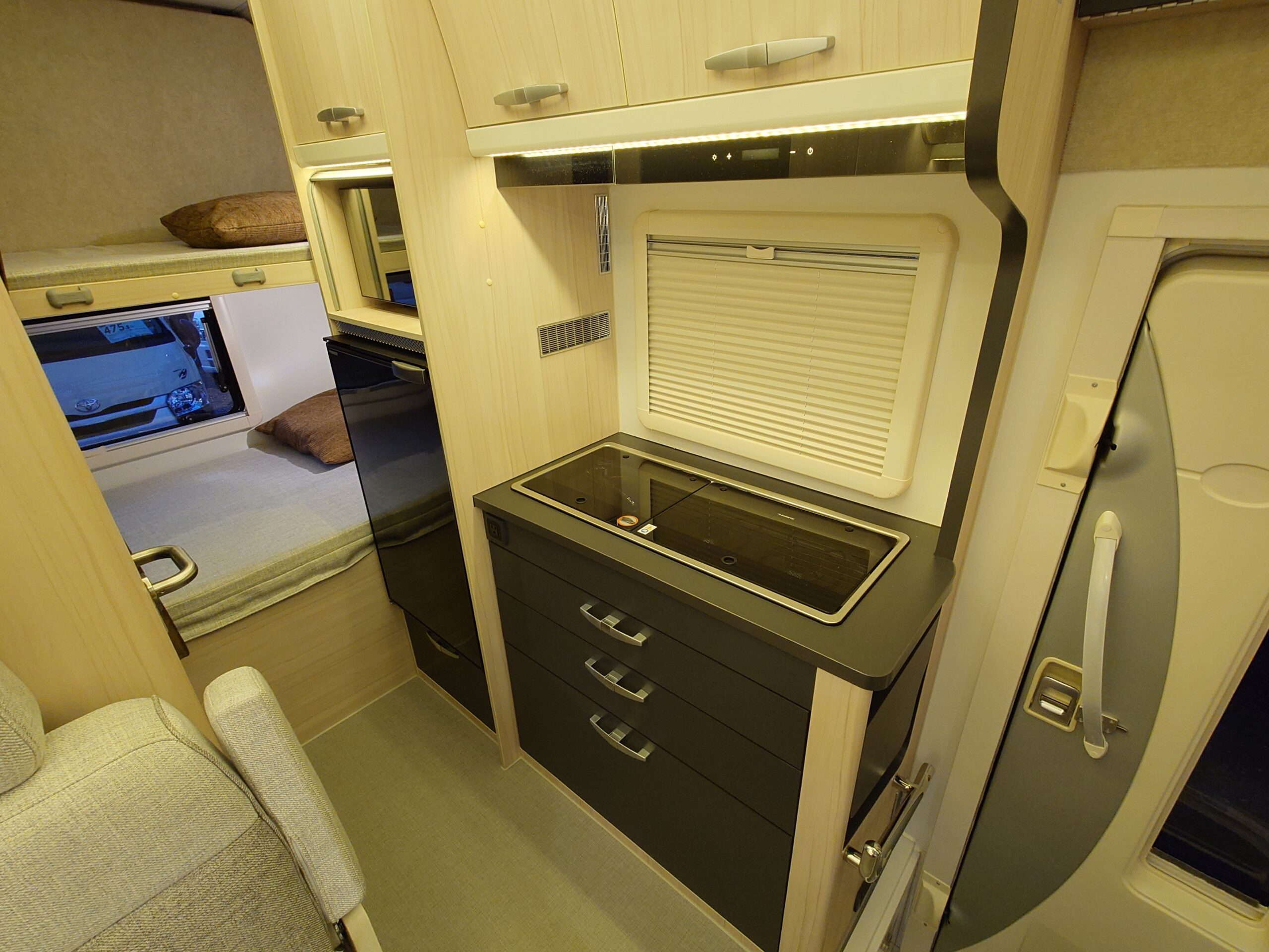 リチウムバッテリー、家庭用エアコン、床暖房、FFヒーター、ソーラーパネル、サイドオーニング、バンクベッド、スカイライトルーフ、常設2段ベッド、カセットトイレ、温水ボイラー、冷蔵庫、電子レンジ、ガラスカバー付シンク&ツーバーナーコンロ、レンジフード、マックスファン、ナビ、バックカメラ