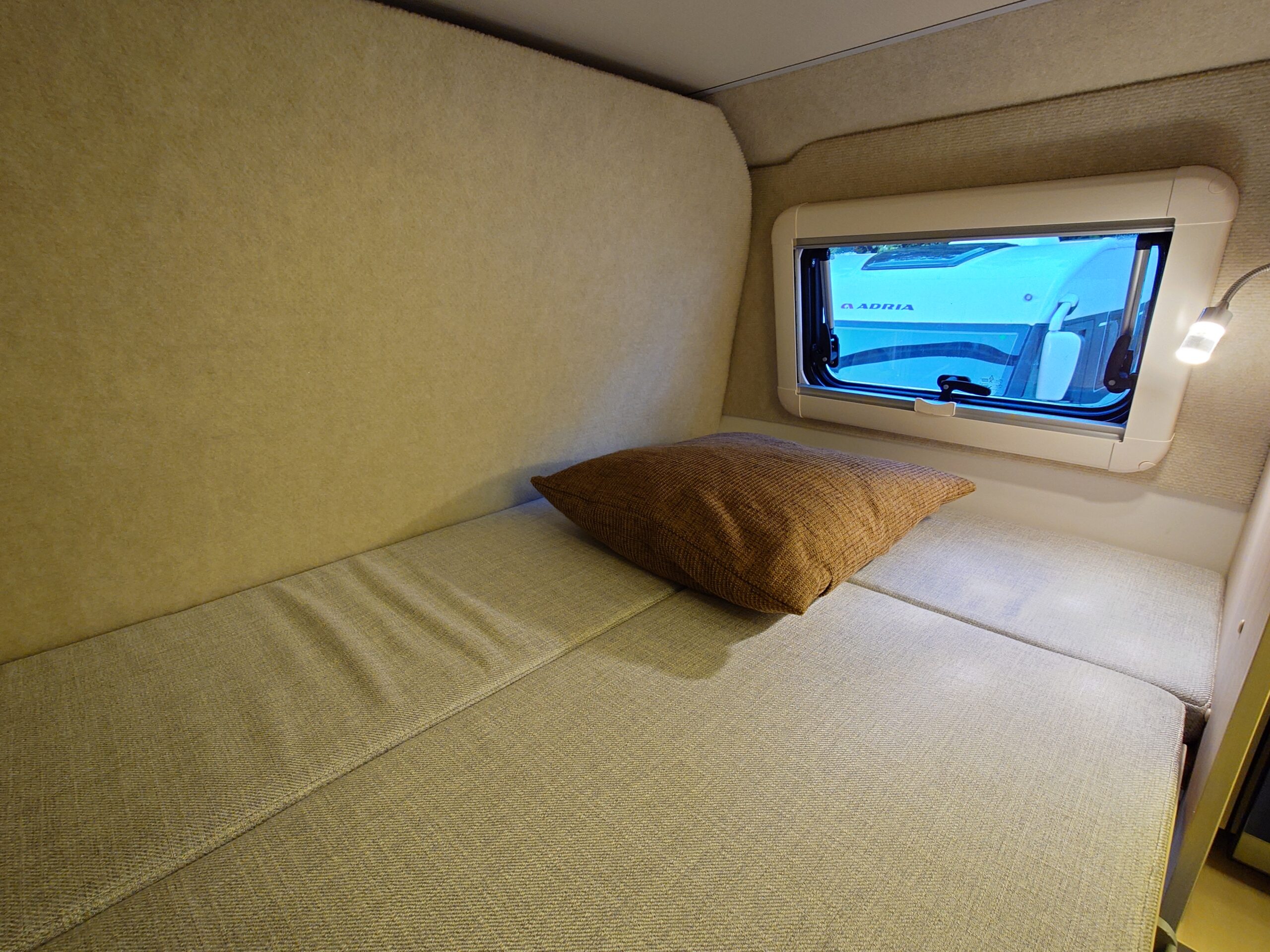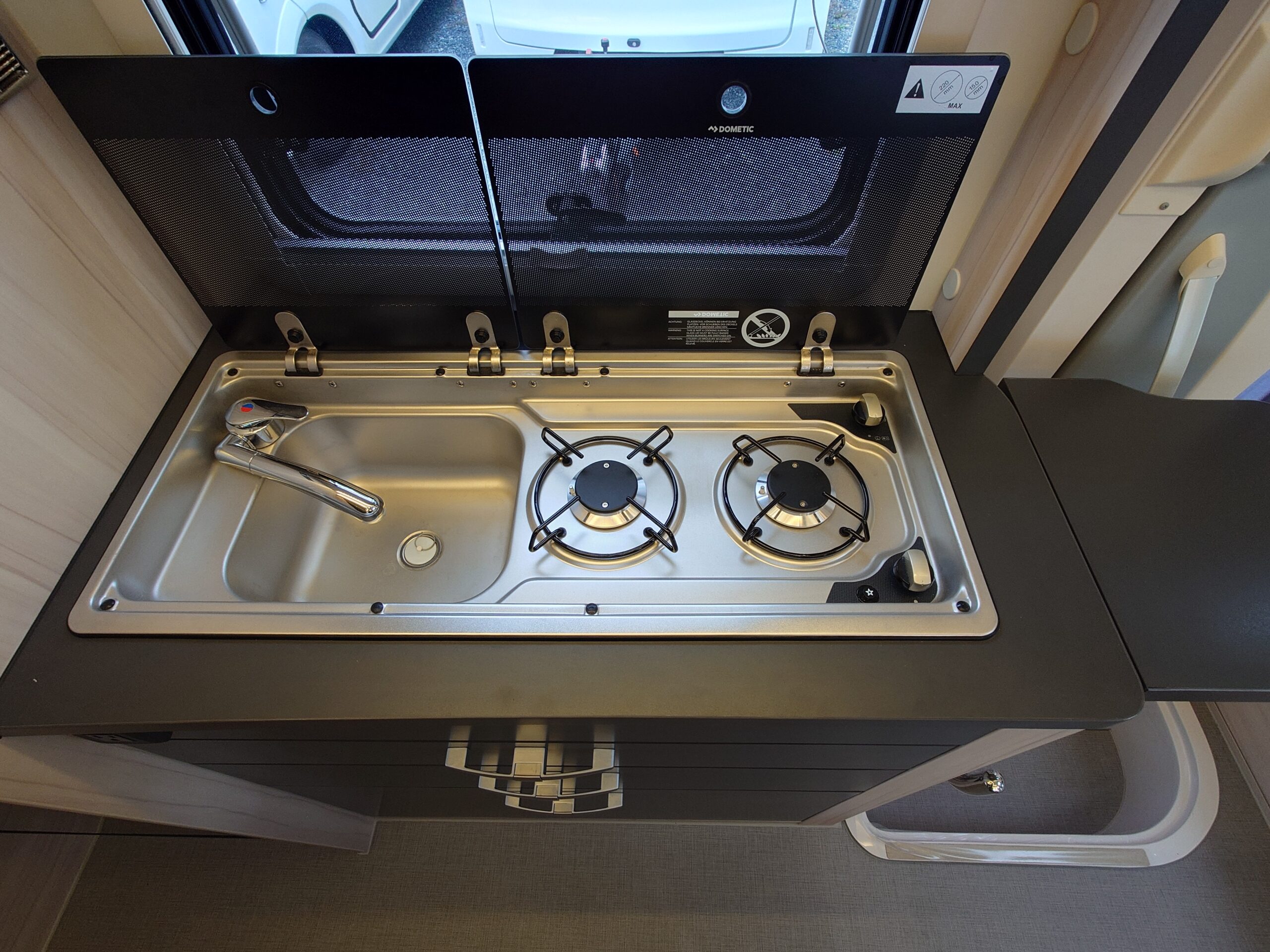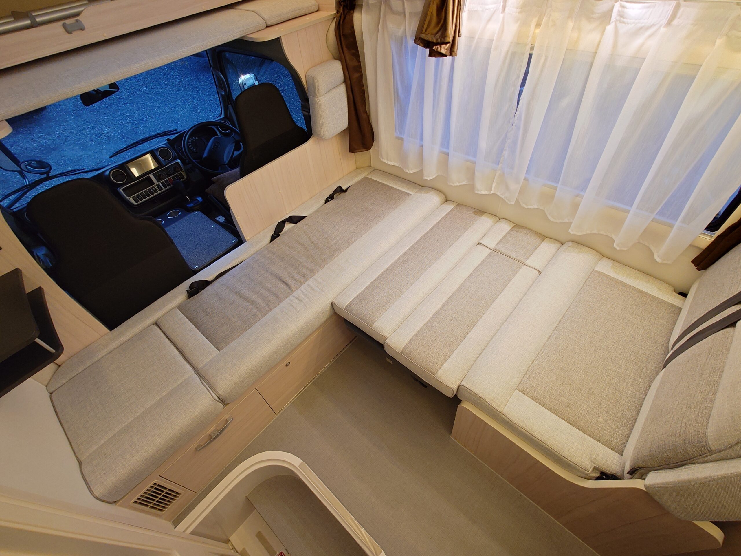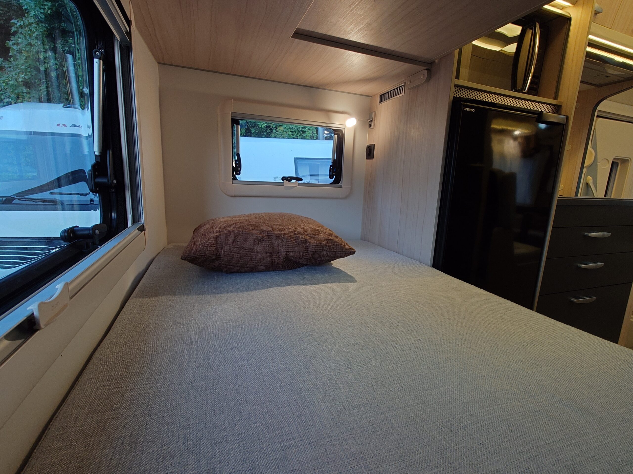 リチウムバッテリー、家庭用エアコン、床暖房、FFヒーター、ソーラーパネル、サイドオーニング、バンクベッド、スカイライトルーフ、常設2段ベッド、カセットトイレ、温水ボイラー、冷蔵庫、電子レンジ、ガラスカバー付シンク&ツーバーナーコンロ、レンジフード、マックスファン、ナビ、バックカメラ