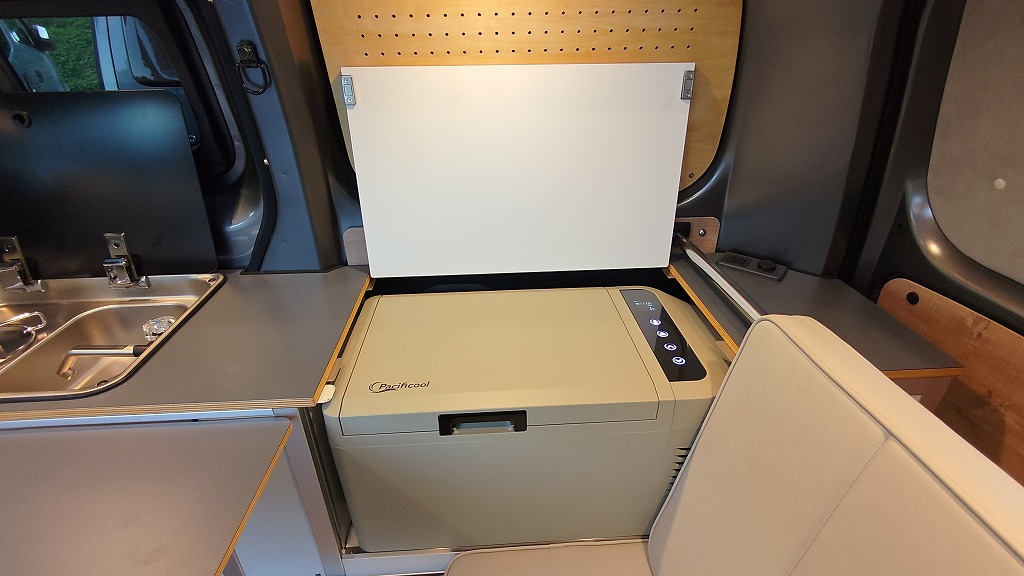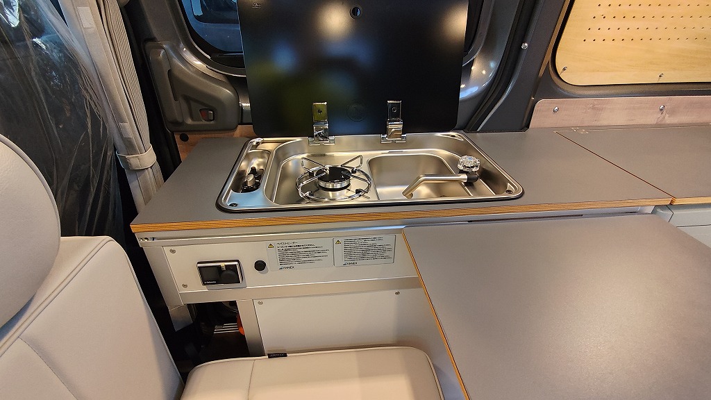 ・ガラスカバー付コンロ一体型シンク、21リットル冷蔵庫を標準装備。